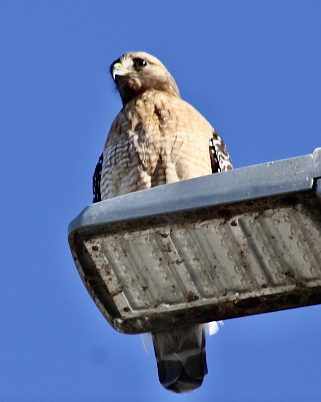 I also captured this Red-shouldered Hawk photo a minute before and about 35 feet away. It appeared to be that the Pigeons were not in fear of this Hawk.
